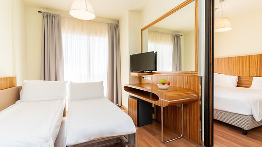 Suite of 44 square meters consisting of two communicating rooms. One room with a large double bed and the second room offers two more comfortable sleeping op-tions. Right...